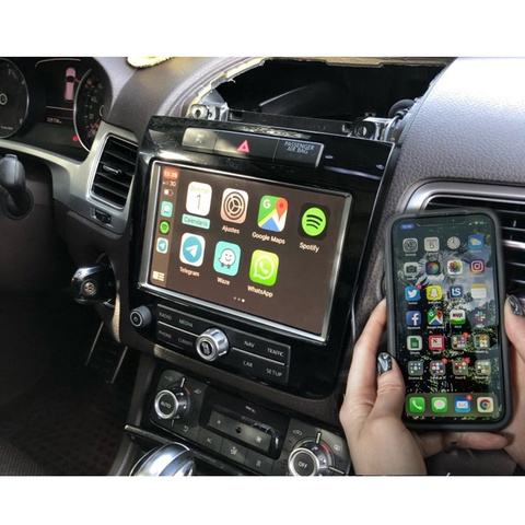 واي فاي CarPlay اللاسلكية لشركة فولكس فاجن طوارق RNS850 OEM الروبوت السيارات أبل CarPlay محول الجبهة كاميرا خلفية واجهة الملاحة